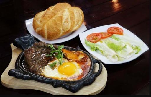 Pan bread includes 5 toppings and served with bánh mì (Vietnamese baguette), salad with vinaigrette, tomatoes, and cucumbers